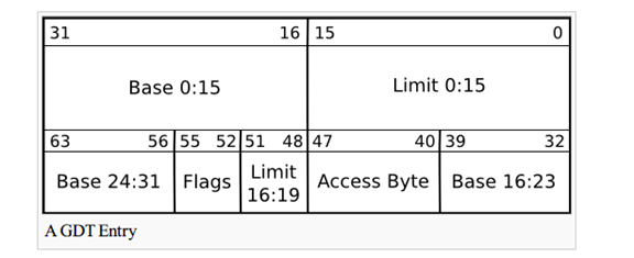GDT 全称是全局段描述符表, 用来提供程序执行是需要的关于内存的各种信息, 表的条目成为GDT Entry, 大小为8字节, 包含了: 段的大小; 段的起始地址; 段的管理属性等信息.其结构如下: