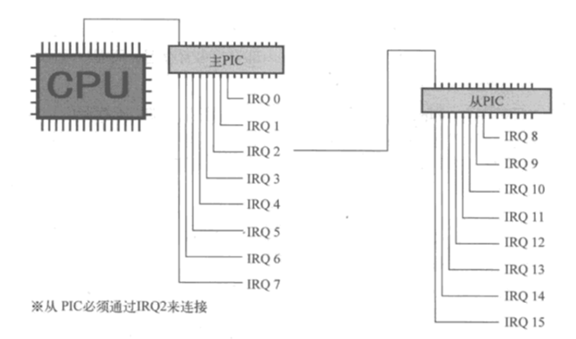 由于CPU的结构限制, 只能处理一个中断, 所以PIC被设计来辅助CPU处理多个中断, PIC的全称是可编程中断控制器, 结构如图, 通过PIC可以控制15个中断, 在现代操作系统中, 8259PIC似乎被APIC所取代.