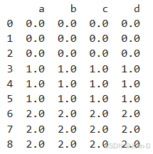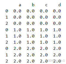 df3=pd.DataFrame(np.ones((3,4))*2,columns=['a','b','c','d'])