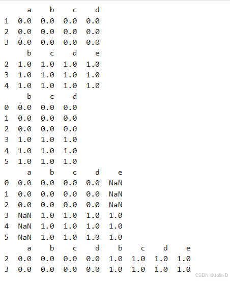 # join=''默认是 'outer',表示并集;join='inner'表示交集;axis=1表示沿数轴方向合并
