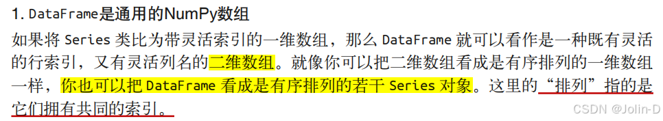 DataFrame是一个表格型的数据结构,它含有一组有序的列,每列可以是不同的值类型(数值、字 符串、布尔值等)。DataFrame既有行索引也有列索引,它可以被看做由Series组成的字典(共用 同一个索引)。DataFrame中的数据是以一个或多个二维块存放的(而不是列表、字典或别的一维 数据结构)。(利用Python进行数据分析p129)