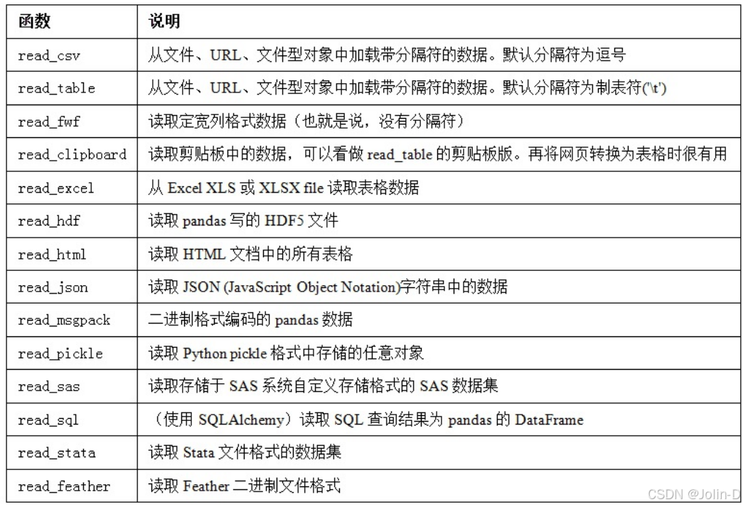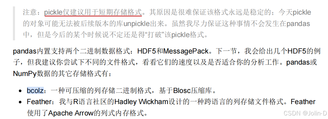 实现数据的高效二进制格式存储最简单的办法之一是使用Python内置的pickle序列化。pandas对象 都有一个用于将数据以pickle格式保存到磁盘上的to_pickle方法: