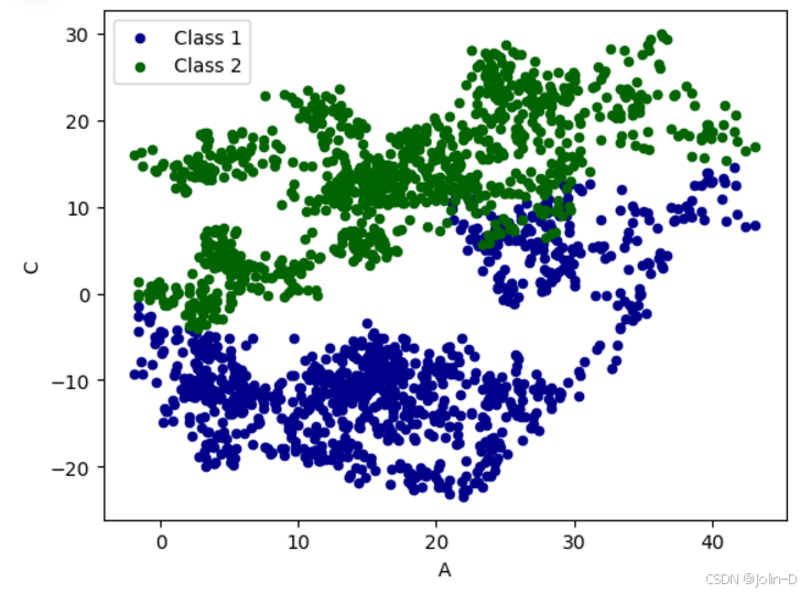 #绘制了另一个散点图,横轴为 A 列,纵轴为 C 列,点的颜色为 DarkGreen,该数据集命名为 Class 2。
