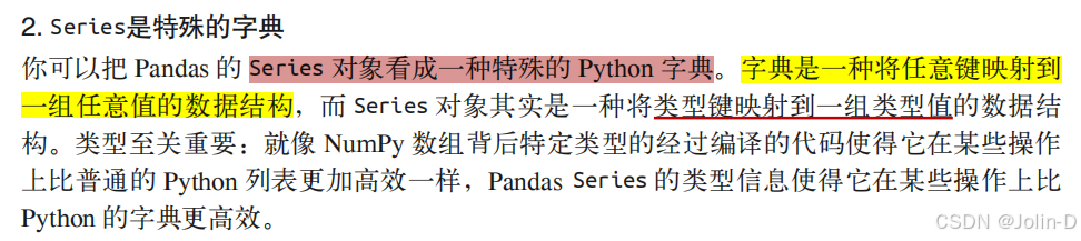 1.Series是一种类似于一维数组的对象,它由一组数据(各种NumPy数据类型)以及一组与之相关 的数据标签(即索引)组成。Series的字符串表现形式为:索引在左边,值在右边。如果没有为数据指定索引,将自动创建一个0到N-1(N为数据的长度)的整数型索引。
