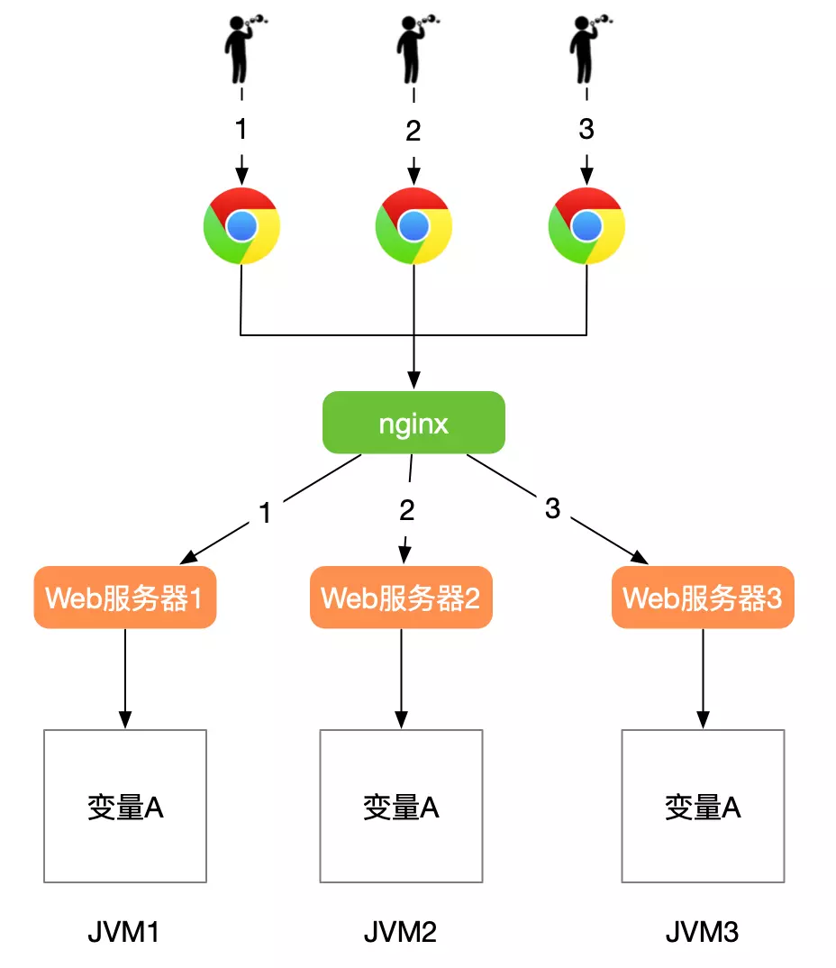 在上图可以看到,变量A在JVM1、JVM2、JVM3三个JVM内存中(这个变量A主要体现是在一个类中的一个成员变量,是一个有状态的对象),如果我们不加任何控制的话,变量A同进都会在JVM分配一块内存,三个请求发过来同时对这个变量进行操作,显然结果不是我们想要的。