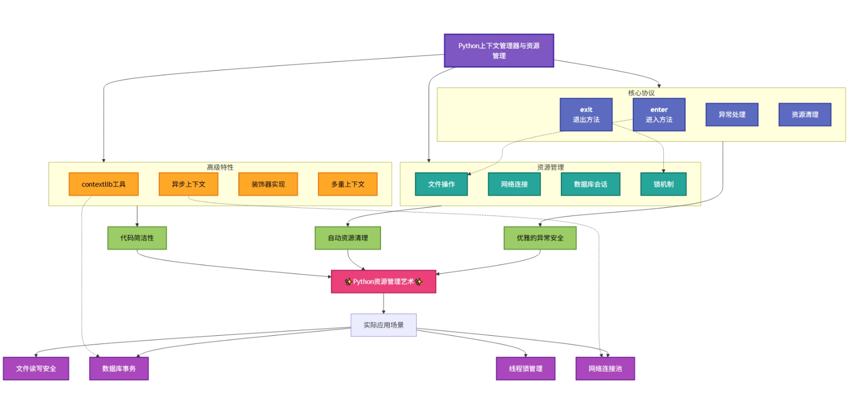上下文管理器是实现了特殊方法__enter__和__exit__的对象,用于定义代码块执行前后的初始化和清理操作。典型应用场景包括文件操作、数据库连接、线程锁等资源管理。