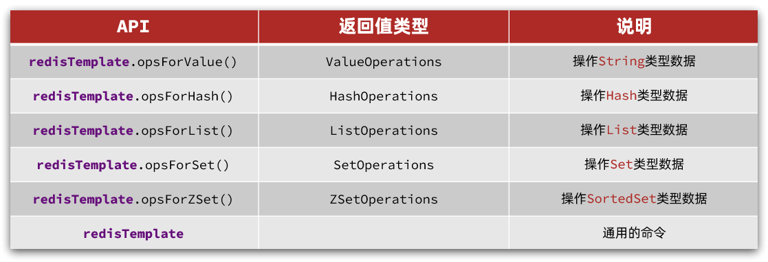 SpringDataRedis中提供了RedisTemplate工具类,其中封装了各种对Redis的操作。并且将不同数据类型的操作API封装到了不同的类型中: