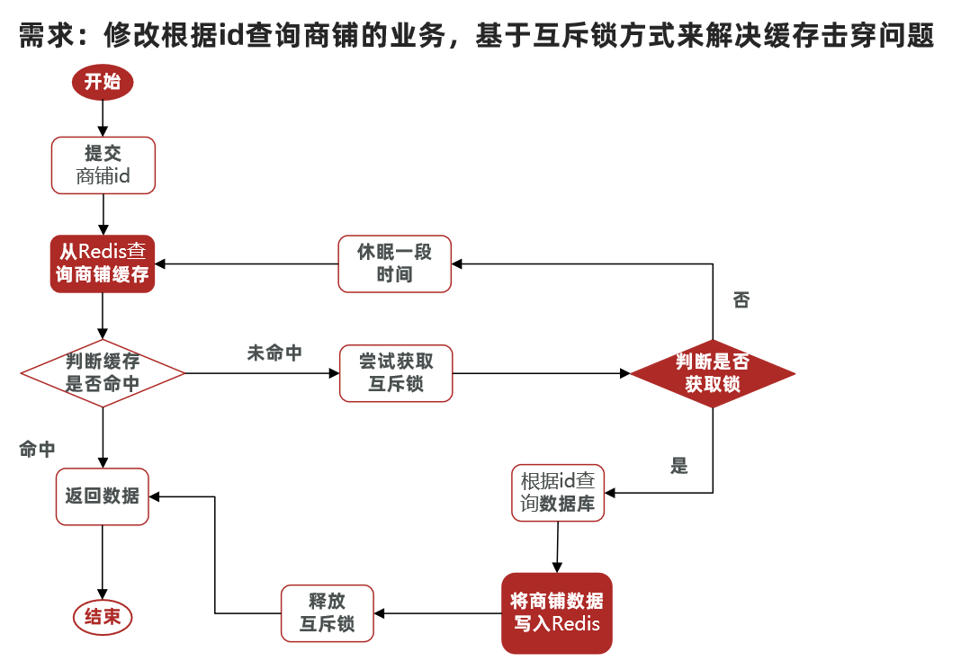 假设现在线程1过来访问,他查询缓存没有命中,但是此时他获得到了锁的资源,那么线程1就会一个人去执行逻辑,假设现在线程2过来,线程2在执行过程中,并没有获得到锁,那么线程2就可以进行到休眠,直到线程1把锁释放后,线程2获得到锁,然后再来执行逻辑,此时就能够从缓存中拿到数据了。