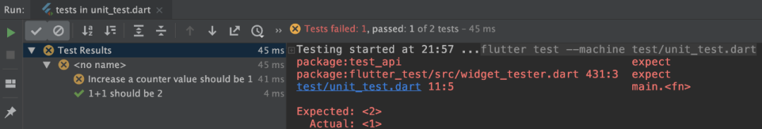 可以看到验证需要使用 expect 函数,将最小可测单元的执行结果与预期进行比较。 另外,测试用例需要包装在 test() 内部,test 是 flutter 提供的测试用例封装类。