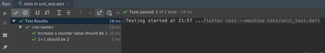 选择 unit_test.dart 文件,在右键弹出的菜单中选择 “Run ‘tests in widget_test’”,就可以启动测试用例了。运行结果如下: