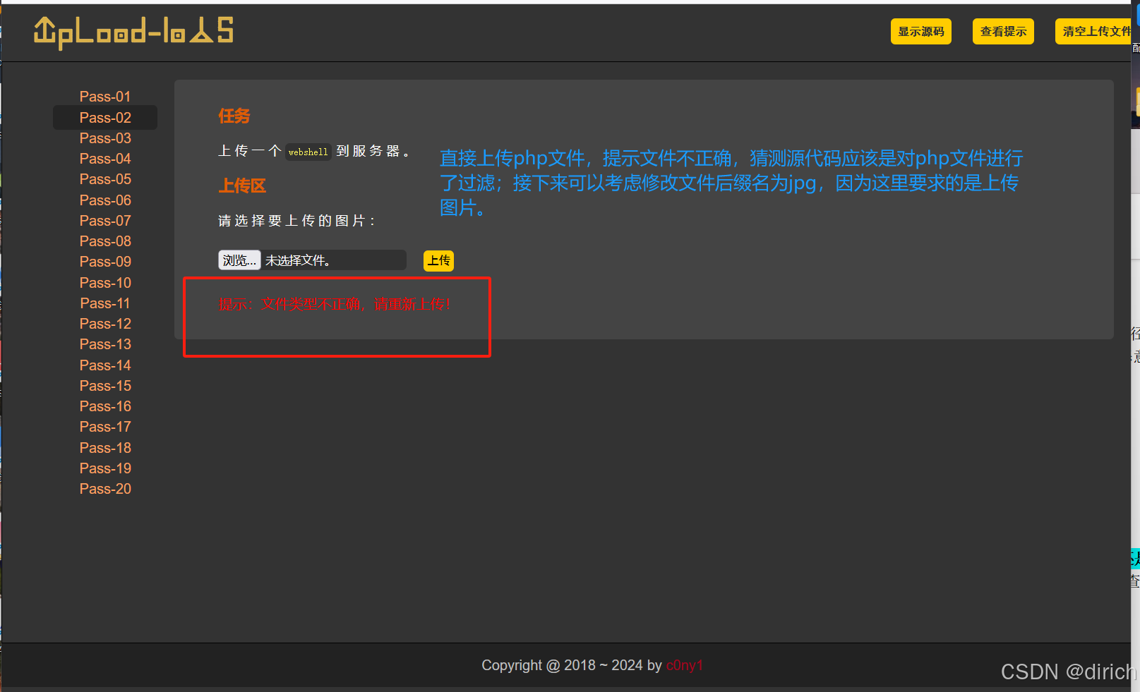 第一关非常简单,是白名单绕过,上传白名单中的文件,然后使用bp抓包修改文件后缀名即可上传成功。这里从第二关开始。