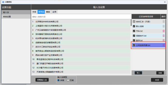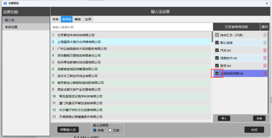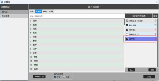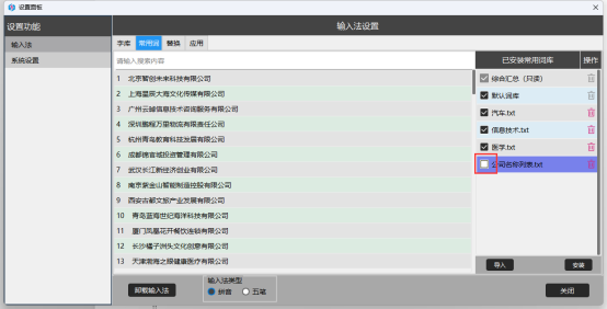 在对应词库前打上勾,即启用词库,词库参与输入法常用词检索,如下图所示。