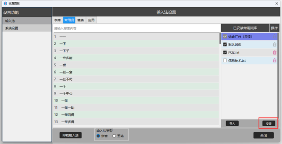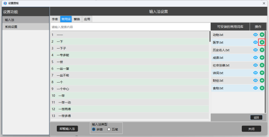 切换到“可安装的常用词库”列表,在对应的词库点击“+”按钮,即安装到输入法词库,如下图所示。