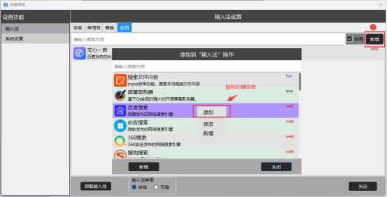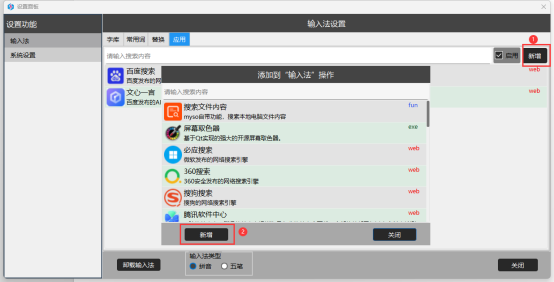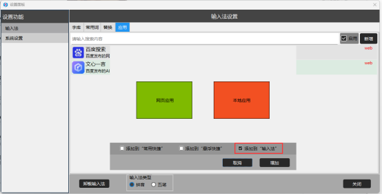 输入法是效率工具的子功能,将应用添加到输入法的前提是应用必须存在于工具,添加应用到工具如下图所示。