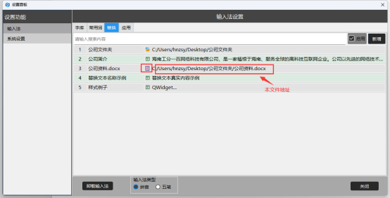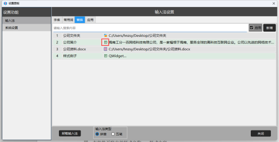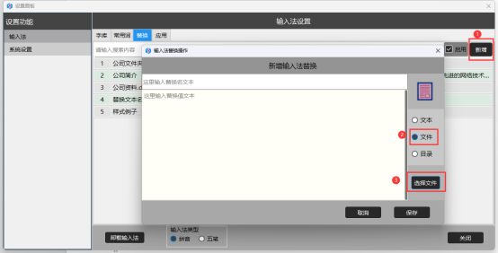 本类型是 替换名称 --> 文件地址。逻辑过程是输入法打字“替换名称”,实际输入的是文件。使用场景是在聊天软件中,有些我们需要高频向用户发送的文件,那么我们可以添加本类型,如下图所示。