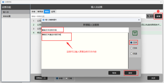 替换功能是本输入法独创重要功能,本功能是把复杂的内容取个简短的名字,在输入法打字显示的是名字,实际输入的是复杂内容。非常适合从事客服的用户使用。