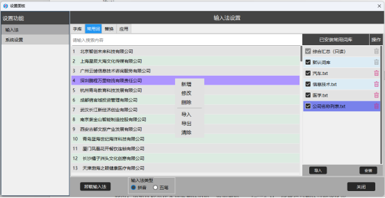 鼠标左键点击右边“已安装常用词库”,左边词库显示列表即显示本词库的常用词,此时对词库的编辑将影响到本词库和“综合汇总”,在展示列表鼠标右键菜单即可编辑词库,如下图所示。