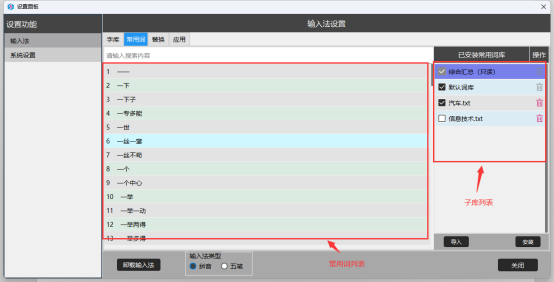 显示子库所有常用词,如果点击“综合汇总(只读)”,本窗口显示输入法所有常用词,体现在本输入法常用词库全貌。