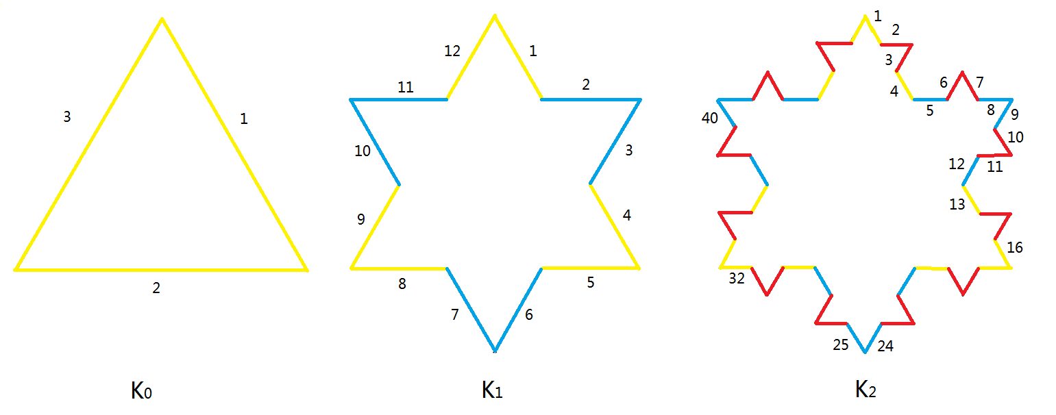 Let Kn be the Koch Snowflake after n-th iteration. It is obvious that the number of sides of Kn, Nn, is 3*4n. Let's number the sides clockwisely from the top of Koch Snowflake.