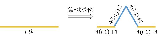 Let si,n be the i-th side of Kn. The generation of si,n is defined as the smallest m satifying si,n is a part of the sides of Km. For example, in the above picture, the yellow sides are of generation 0; the blue sides are of generation 1; the red sides are of generation 2.