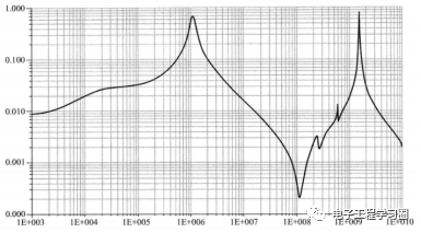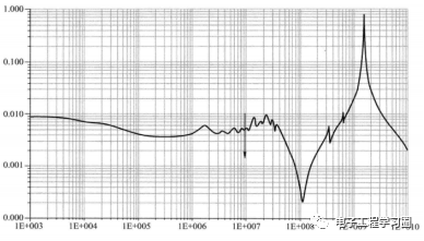 对电源与地平面间的阻抗特性分析可以采用仿真软件进行,可以得到一个PDN(电源分配网络)的输入阻抗,例如下图所示: