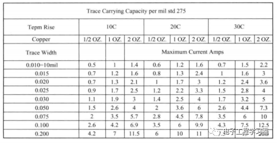 此类噪声主要由走线的直流电阻与寄生电感造成,需要考虑线路板过孔的通流能力,同时也要考虑线宽与电流的关系,如下图所示。