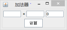 1 package test; 2 import java.awt.*; 3 import javax.swing.*; 4 import java.awt.event.*; 5 public class FrameDemo2 6 { 7 static JTextField field1=new JTextField(5); 8 static JTextField field2=new JTextField(5); 9 static JTextField field3=new JTextField("0",5); 10 11 public FrameDemo2(){ 12 JFrame f=new JFrame("加法器"); 13 f.setDefaultCloseOperation(JFrame.EXIT_ON_CLOSE); 14 f.setSize(220,100); 15 f.setLocation(500,300); 16 JLabel jb=new JLabel("+"); 17 f.setVisible(true); 18 JPanel p1=new JPanel(); 19 f.setContentPane(p1); 20 p1.setLayout(new FlowLayout()); 21 22 p1.add(field1); 23 p1.add(jb); 24 p1.add(field2); 25 p1.add(field3); 26 JButton b1=new JButton("计算"); 27 Color bg=new Color(255,255,255); 28 b1.setBackground(bg); 29 p1.add(b1); 30 31 b1.addActionListener(new ActionListener() 32 { 33 public void actionPerformed(ActionEvent e) //重写actionPerformed方法 34 { 35 int a,b; 36 a=Integer.parseInt(field1.getText()); //获取TextField1中的数据 37 b=Integer.parseInt(field2.getText()); 38 field3.setText(String.valueOf(a+b)); 39 } 40 } 41 ); 42 } 43 public static void main(String args[]) 44 { 45 FrameDemo2 fd=new FrameDemo2(); 46 } 47 }