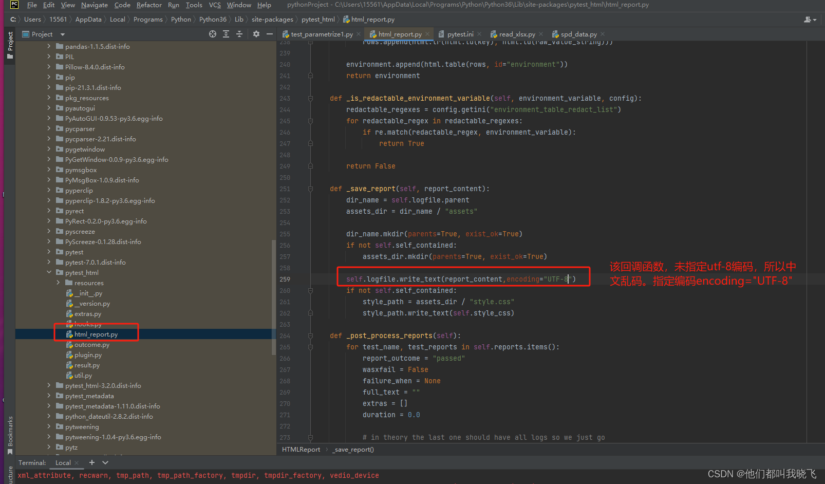 解决编码问题:找到pytest-html/pytest-report文件,指定utf8编码