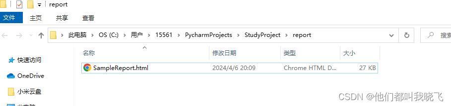 。在命令行中输入:pytest --html=report\SampleReport.html .\testcase\ 执行后生成html报告文件: