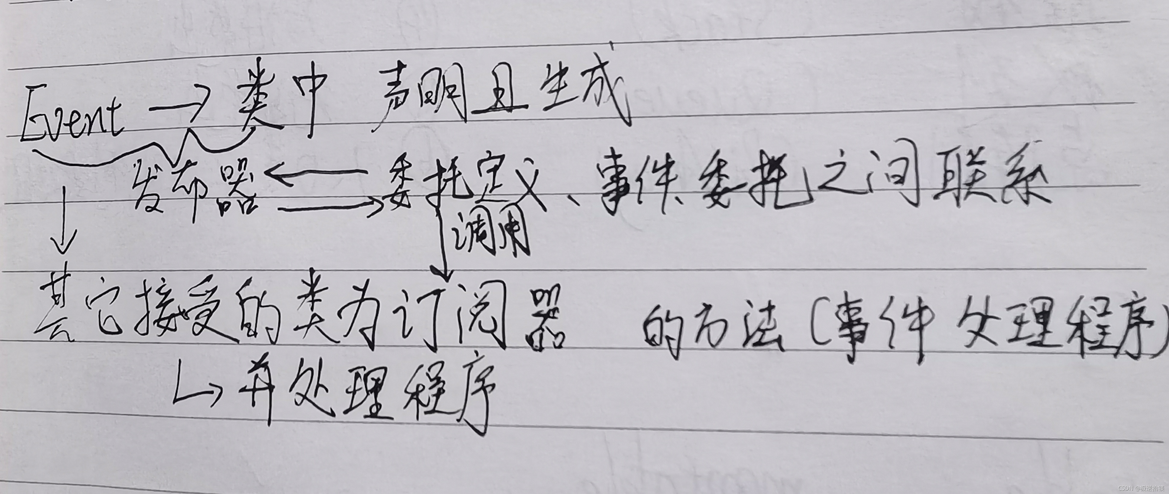 事件在类中声明且生成,且通过使用同一个类或其他类中的委托与事件处理程序关联。包含事件的类用于发布事件。这被称为发布器类,其他接受该事件的类称为订阅类,事件使用发布-订阅模型。