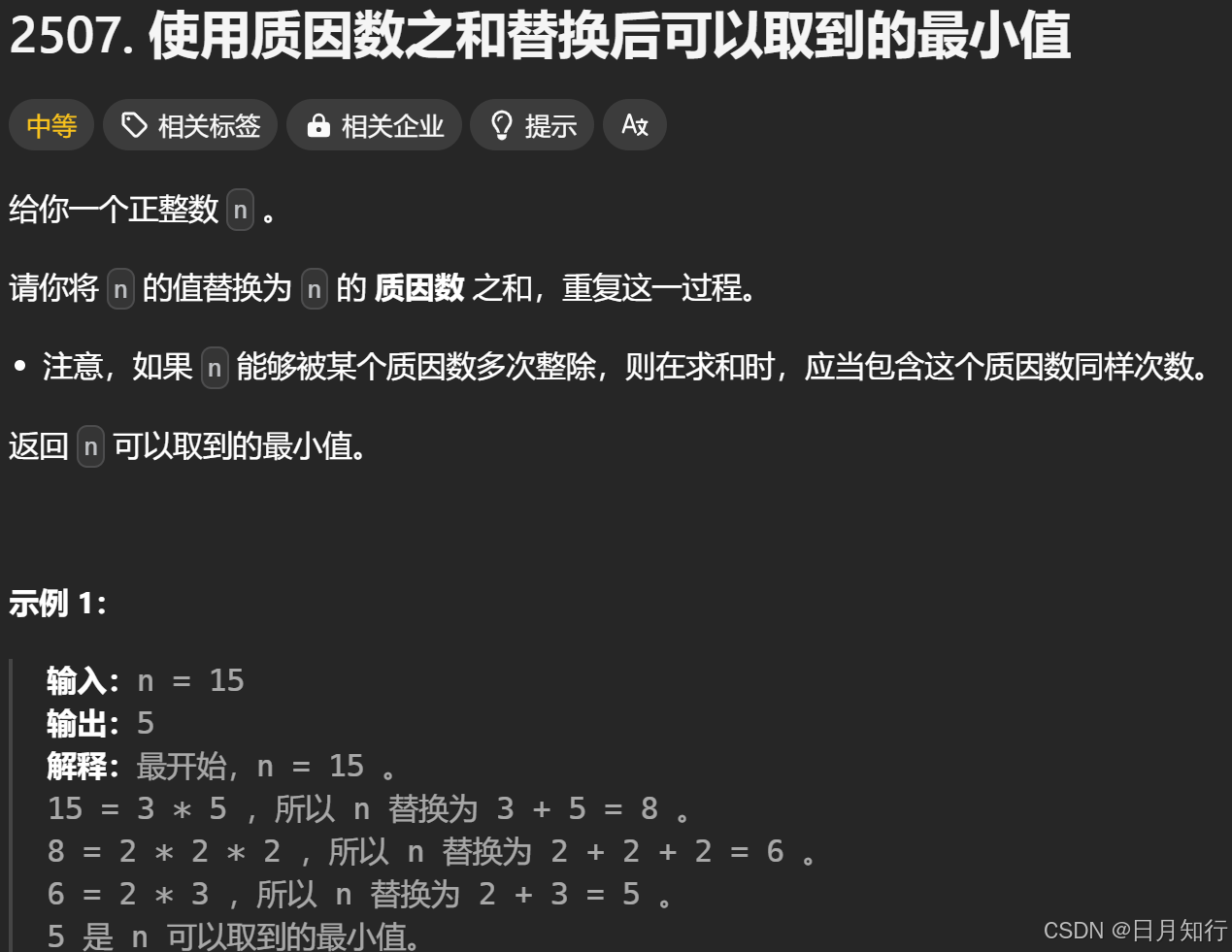 15除2除不尽,15除3,能除,除了一次,tem为15/3=5,ans+3;tem再除3时除不尽了,i++;tem除4,除不尽,i++;tem除5能出尽,tem=5/5=1,ans=3+5等于8;tem不在大于1,外循环结束。