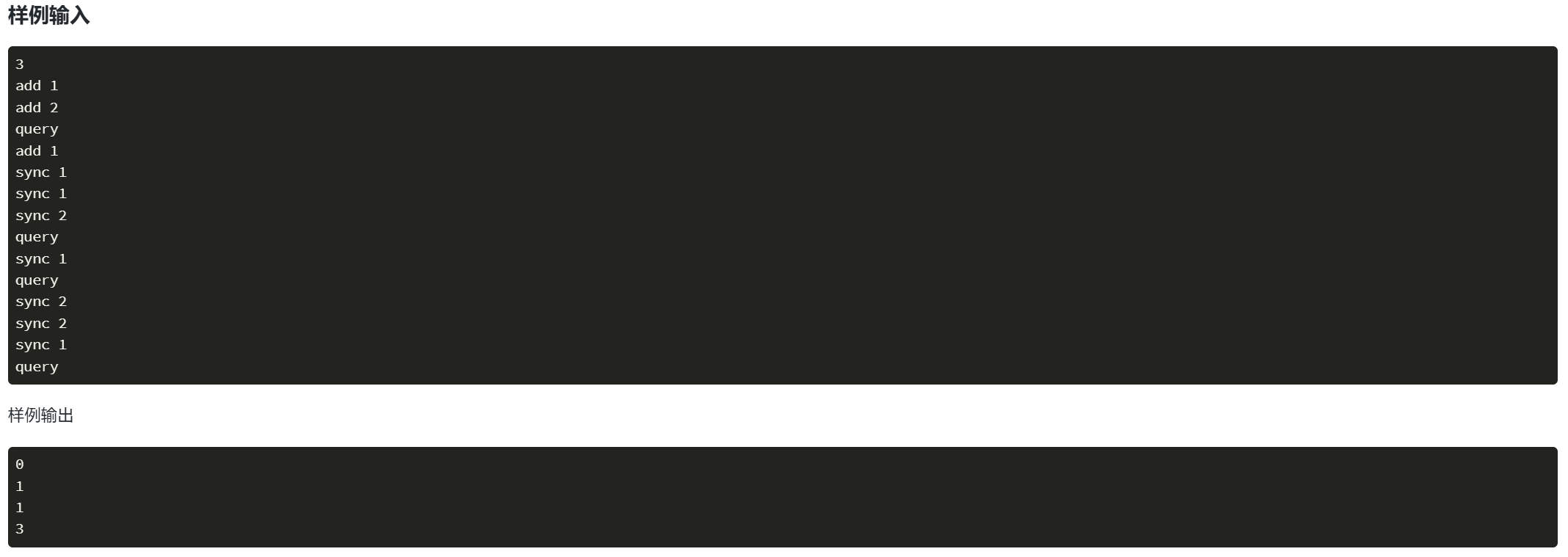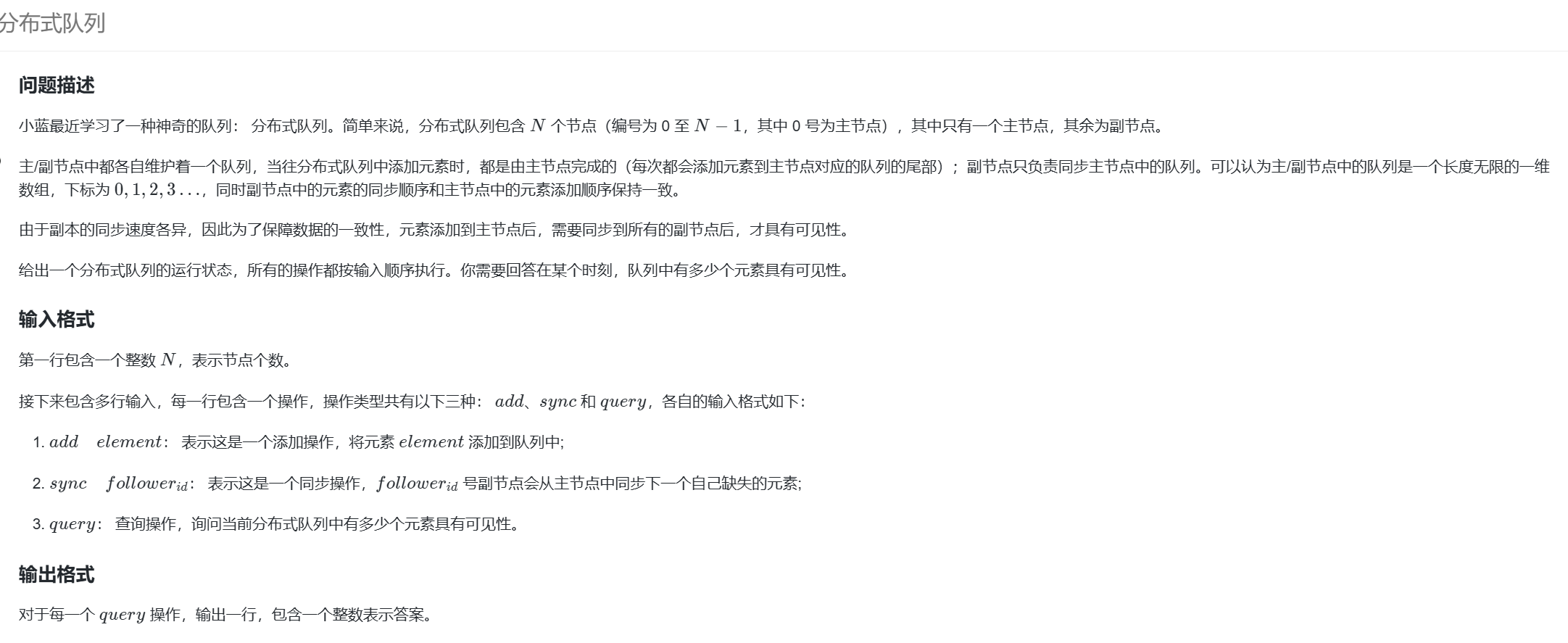这一题,意思是:有n个队列,只有一个主队列,add是将元素添加到主队列,sync作用 :followerid: 表示这是一个同步操作,followerid 号副节点会从主节点中同步下一个自己缺失的元素,例如sync 3是将一个元素(与主节点中缺失的一个元素)添加到附节点3号中,query是看所有的节点中都同步的个数。