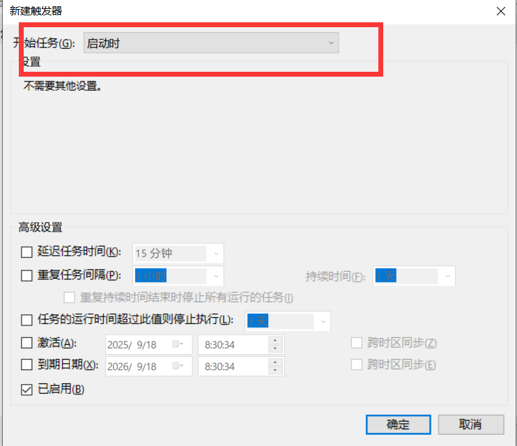 若想要开机启动时执行,选择触发器并新建,开始任务选择“启动时”