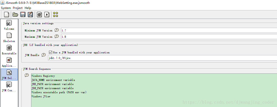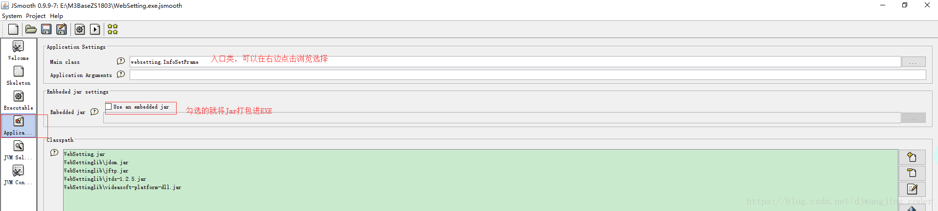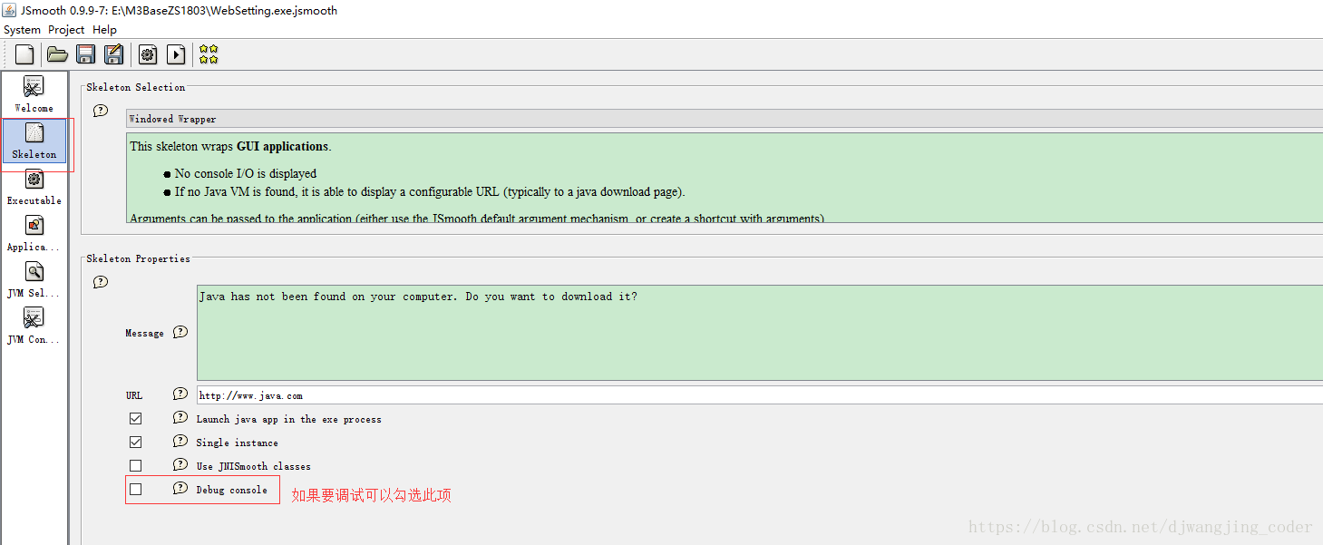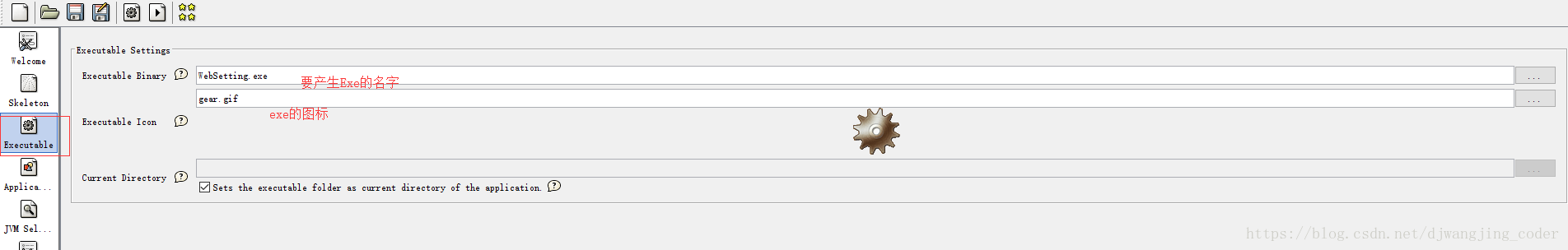 第一步选择Skeleton,如图填写 第二步选择Execute able 第三步Application setting 我没有勾选把jar打进exe,这个时候就要求jar包和Exe必须在同一目录下 最后一步配置JVM