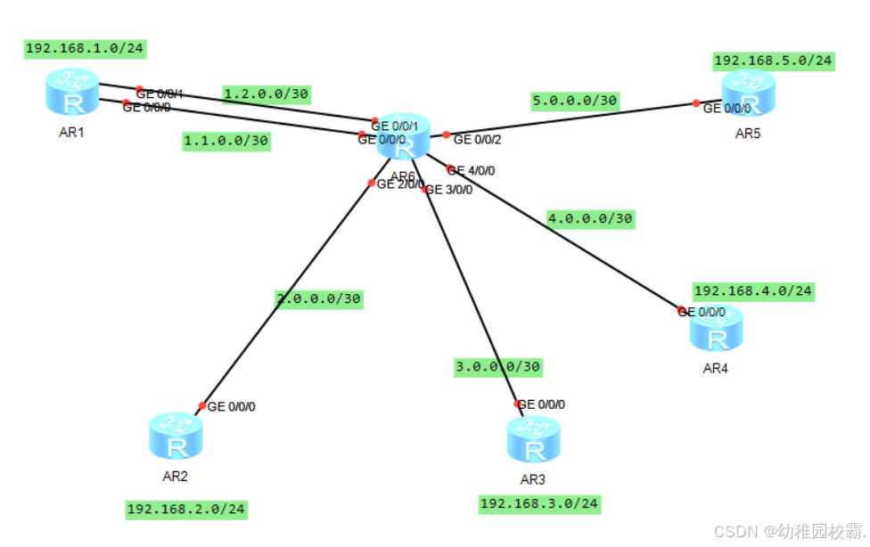 1.R6为ISP只能配置IP地址,R1-R5的环回为私有网段;
