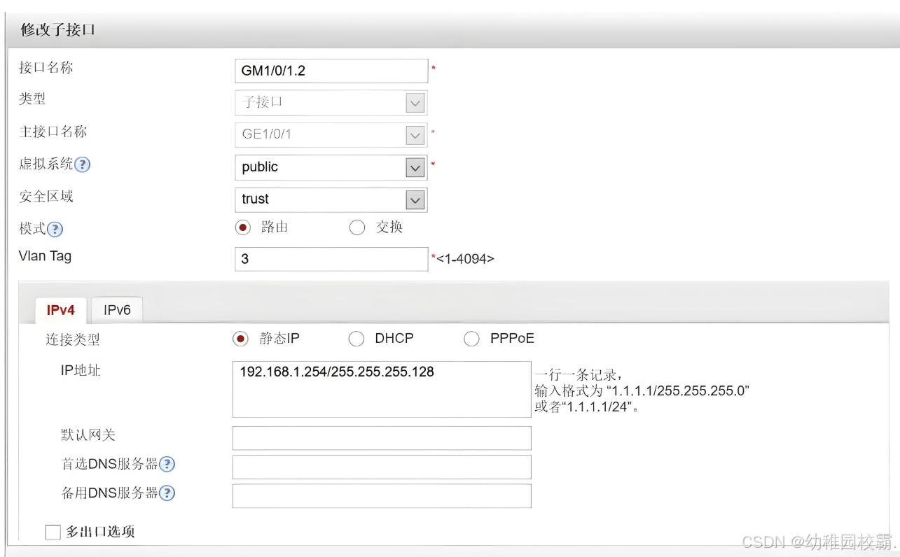[USG6000V1-GigabitEthernet1/0/1.1]interface GigabitEthernet 1/0/1.2
