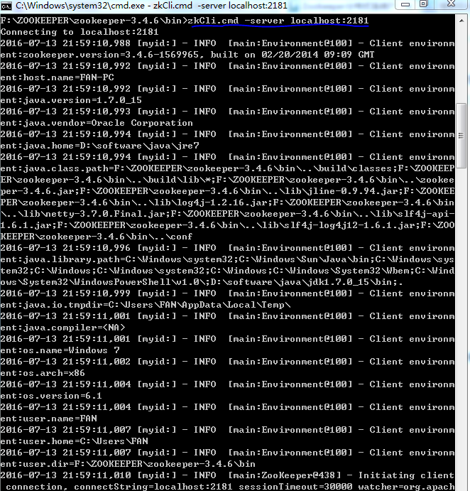 任意选择一个server目录, 启动客户端:bin/zkCli.cmd -server localhost:4180