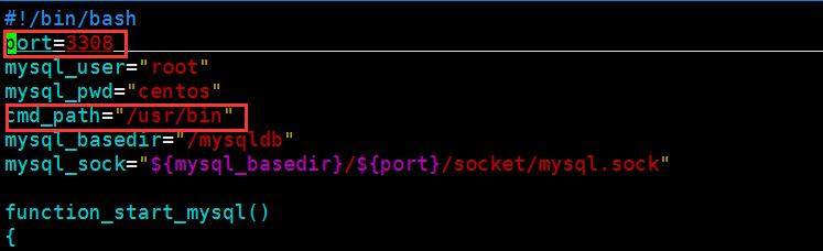 [root@centos7 ~]# cat mysqld #脚本示例 #!/bin/bash port=3306 #需要修改为当前实例的端口号 mysql_user="root" mysql_pwd="" cmd_path="/app/mysql/bin" #安装目录下的bin mysql_basedir="/mysqldb" #实例数据库文件所在目录 mysql_sock="${mysql_basedir}/${port}/socket/mysql.sock" function_start_mysql() { if [ ! -e "$mysql_sock" ];then printf "Starting MySQL...\n" ${cmd_path}/mysqld_safe --defaults-file=${mysql_basedir}/${port}/etc/my.cnf &> /dev/null & else printf "MySQL is running...\n" exit fi }