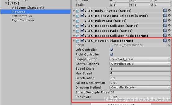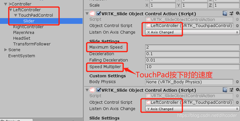 - 真正实现圆盘控制主角移动,还需要 VRTK_SlideObjectControl Action 脚本设置轴偏移量,并且要指定 Object Controller Scripts