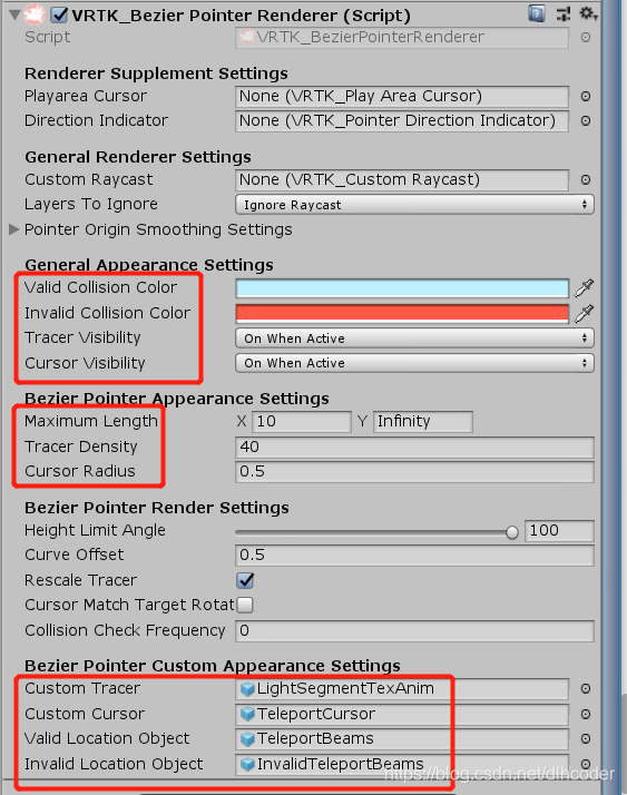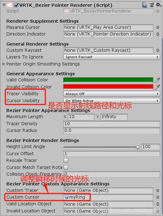 直射线渲染脚本(或 VRTK_Bezier Pointer Renderer曲射线脚本组件,射线的模型和目标点模型等参数可自定义),VRTK_Pointer脚本中指定Pointer Render类型;