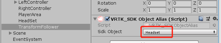 - 创建空对象,命名TransForm Follower(自定义),挂载 VRTK_SDK Object Alias 脚本,参数选择 HeadSet 也就是跟随对象选择头盔