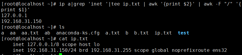 命令:ip a|grep 'inet '|tee ip.txt | awk '{print $2}' | awk -F "/" '{print $1}'