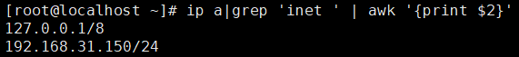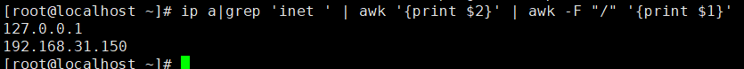 命令:ip a|grep 'inet ' | awk '{print $2}' | awk -F "/" '{print $1}'