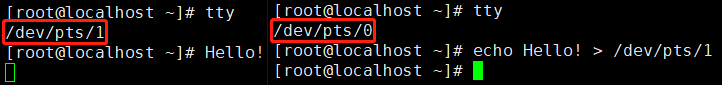 在设备 /dev/pts/0 给设备 /dev/pts/1 发出 Hello!,那么在 /dev/pts/1 设备上就能显示 /dev/pts/0发过来的消息。