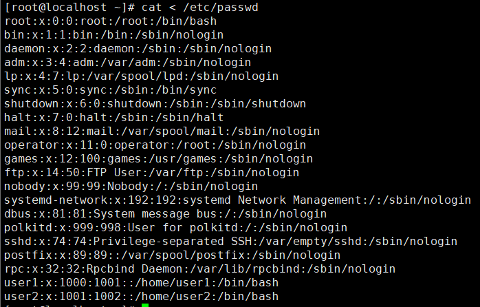 而输入重定向 cat < /etc/passwd 是将passwd文件指定为输如设备,并将内容显示到控制台。