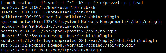 命令:sort -t ":" -k3 -n /etc/passwd -r | head