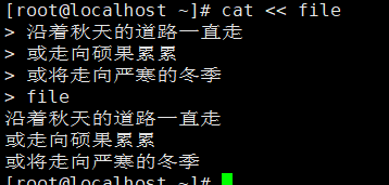 cat << file (这个字符串字符是任意的,没有任何含义),他的作用是将file 字符之间的内容(document)作为输入传递给cat 碰到file 将自动结束输入,并将输入的内容显示出来;