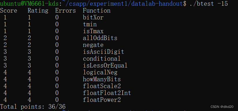 datalab是csapp的第一个实验,主要让我们深入了解计算机系统中二进制的使用规则,这其中分为整型和浮点型。由于浮点型有一套人为制定的编码规则,因此理解起来有些难度。这小小的13个实验却几乎涵盖了所有二进制的知识,身为大一新生的我做起来颇具挑战。我在阅读csapp书籍时,二十页就要花费我至少一个半小时的时间细读才能读懂,可见其知识深度。这13个实验对我来说最难的莫过于后三个关于浮点型的实验。如果不事先充分了解其编码规则,做起来十分的困难。不过当看到测试结果一点点由0分变为36分满分时,心情是无比激动的。期待后面的实验!