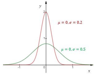 在上图中,当σ=0.2时,曲线更陡峭,倒钟更窄,样本更向μ处集中。