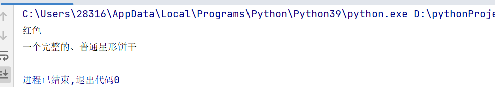 class Cookie: def __init__(self, shape, has_chocolate=False): """初始化饼干的属性""" self.shape = shape # 饼干形状(如圆形、方形) self.has_chocolate = has_chocolate # 是否有巧克力豆 self.is_broken = False # 饼干是否被掰断 self.toppings = [] # 饼干上的配料 def break_cookie(self): """将饼干掰成两半""" if self.is_broken: # 修改为直接判断is_broken为True的情况 return "饼干已经是碎的了..." else: self.is_broken = True return f"{self.shape}饼干被掰成了两半!" def add_topping(self, topping): """在饼干上添加配料(如涂果酱)""" self.toppings.append(topping) return f"饼干上添加了{topping}!" def __str__(self): """返回饼干的描述信息""" status = "碎的" if self.is_broken else "完整的" chocolate = "有巧克力豆的" if self.has_chocolate else "普通" toppings = f",上面有{', '.join(self.toppings)}" if self.toppings else "" return f"一个{status}、{chocolate}{self.shape}{toppings}饼干" #返回值 a = Cookie('Round',True) #'round' 给self.shape赋值,has_chocol=True a.is_broken = False #饼干被掰碎是False a.toppings.append('jam') #上面的调料是jam print(a)
